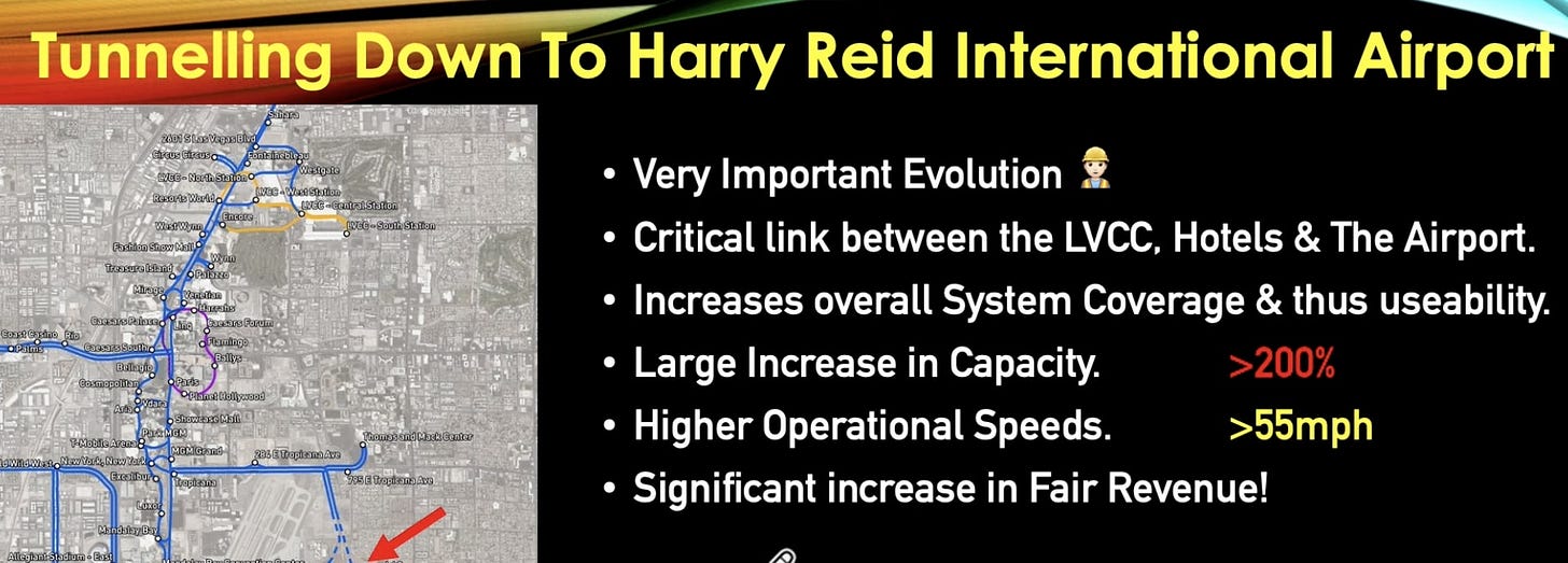 The Boring Company is prioritizing an extension of the Las Vegas Convention Center Loop to go to the Vegas Airport. This will greatly increase the usage and revenue generation of the system. The Boring company Loop should be able to provide consistent 7-ten minute travel times to the airport from the strip.
