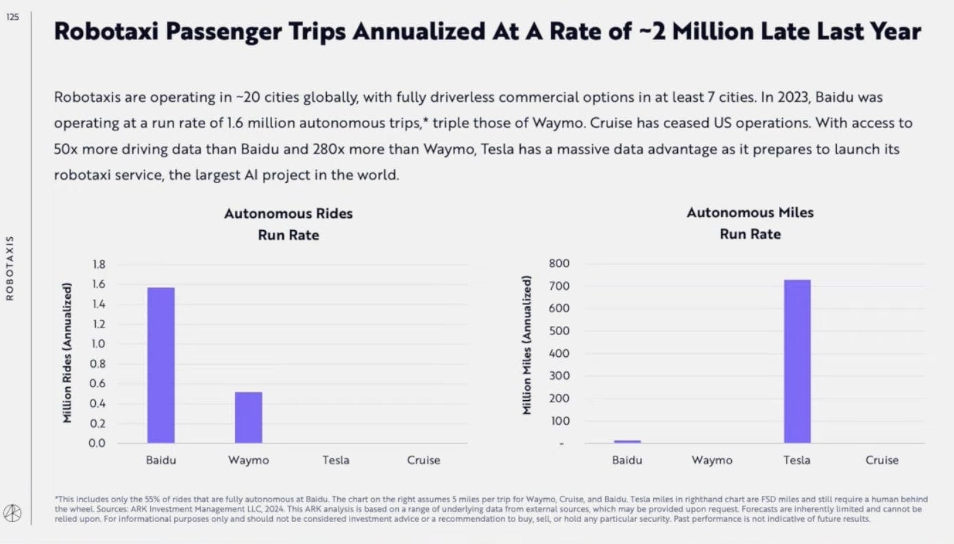 Ark Invest has observed that Baidu robotaxi is several times bigger than Waymo. They also report that the robotaxi and Tesla FSD systems are already safer than human driving. These are observations that Nextbigfuture has already reported over the past few weeks in more detail.