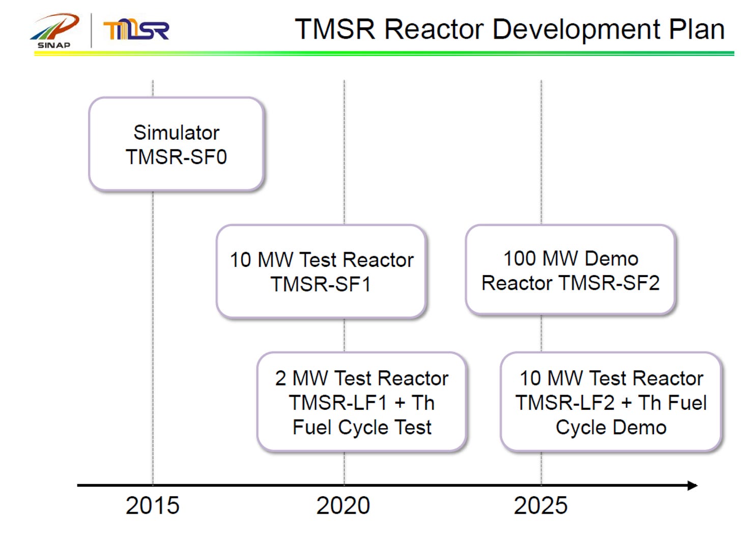 China is starting the operation of its 2 megawatt molten salt prototype reactor in 2024. They are progressively scaling up to 10 MW reactors, 100 MW and then a 168 MWe modular reactor around 2030.