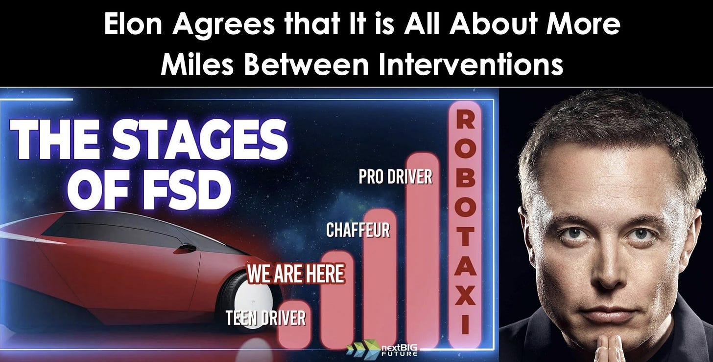 Elon and Nextbigfuture Agree that All that Matters is More Self Driving Miles Between Interventions