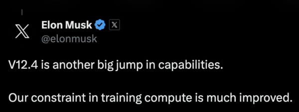 Elon Musk says Tesla FSD V12.4 is another big jump in capabilities and the training compute limitations are almost gone.
