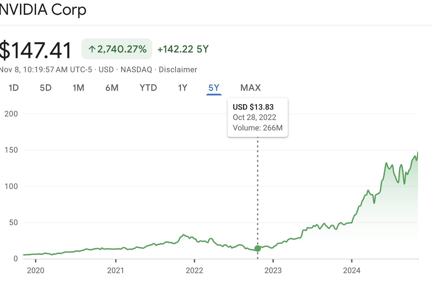 Nvidia had a ten times increase after the ChatGPT kicked off massive purchases in AI chips. Tesla will become the AI story with full self driving, robotaxi and licensing to other car companies. Nvidia did still have massive pullbacks during its run which is still continuing.