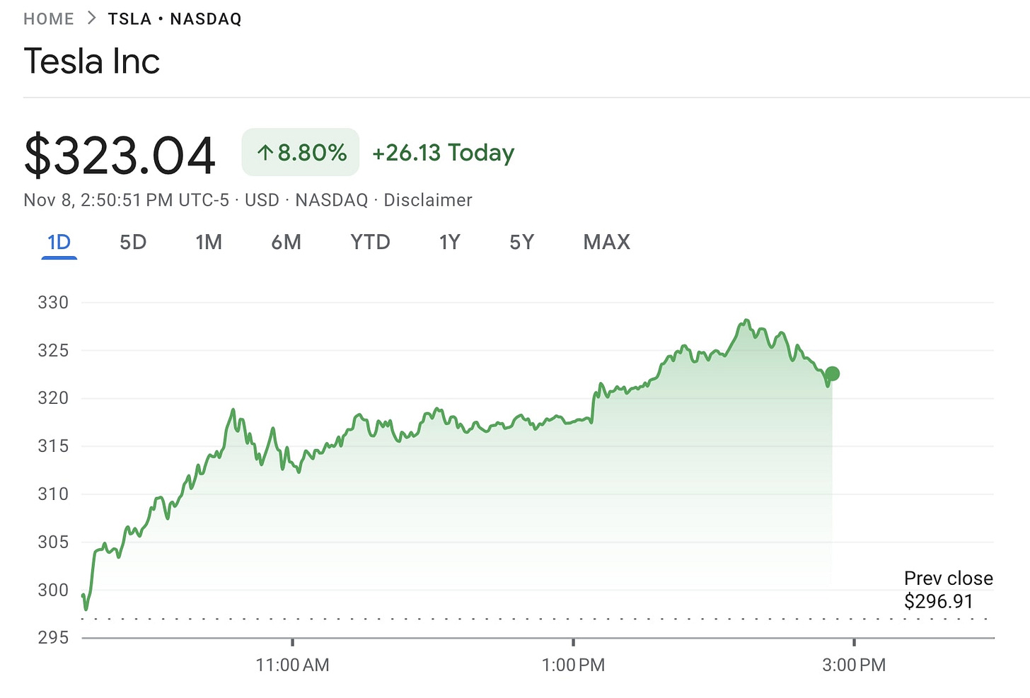 There is a bull market in stacks after the election. This will likely last for 2-4 months. Tesla has had a strong runup of 32% ($79) in five days. Tesla should have a strong fourth quarter with more earnings from cars, energy and FSD. There are more improvements with 4680 batteries which lowers costs for Tesla. This will increase margins and earnings. FSD could have breakthroughs with approvals in China and Europe.