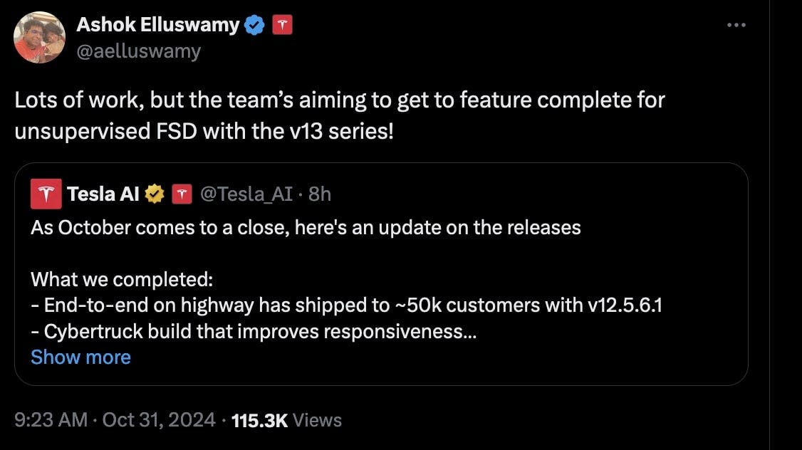 Solving robotaxi and full self driving is key to Tesla's future. Version 13.X should get them from 12% FSD adoption (% of people who buy a Tesla who get FSD) in the US to 25% adoption worldwide (China, Europe etc…) it will be smooth and comfortable. Everyone else is at 12.1 or v 11 or worse. Everyone other company’s self driving system is 600X worse than Version 13.