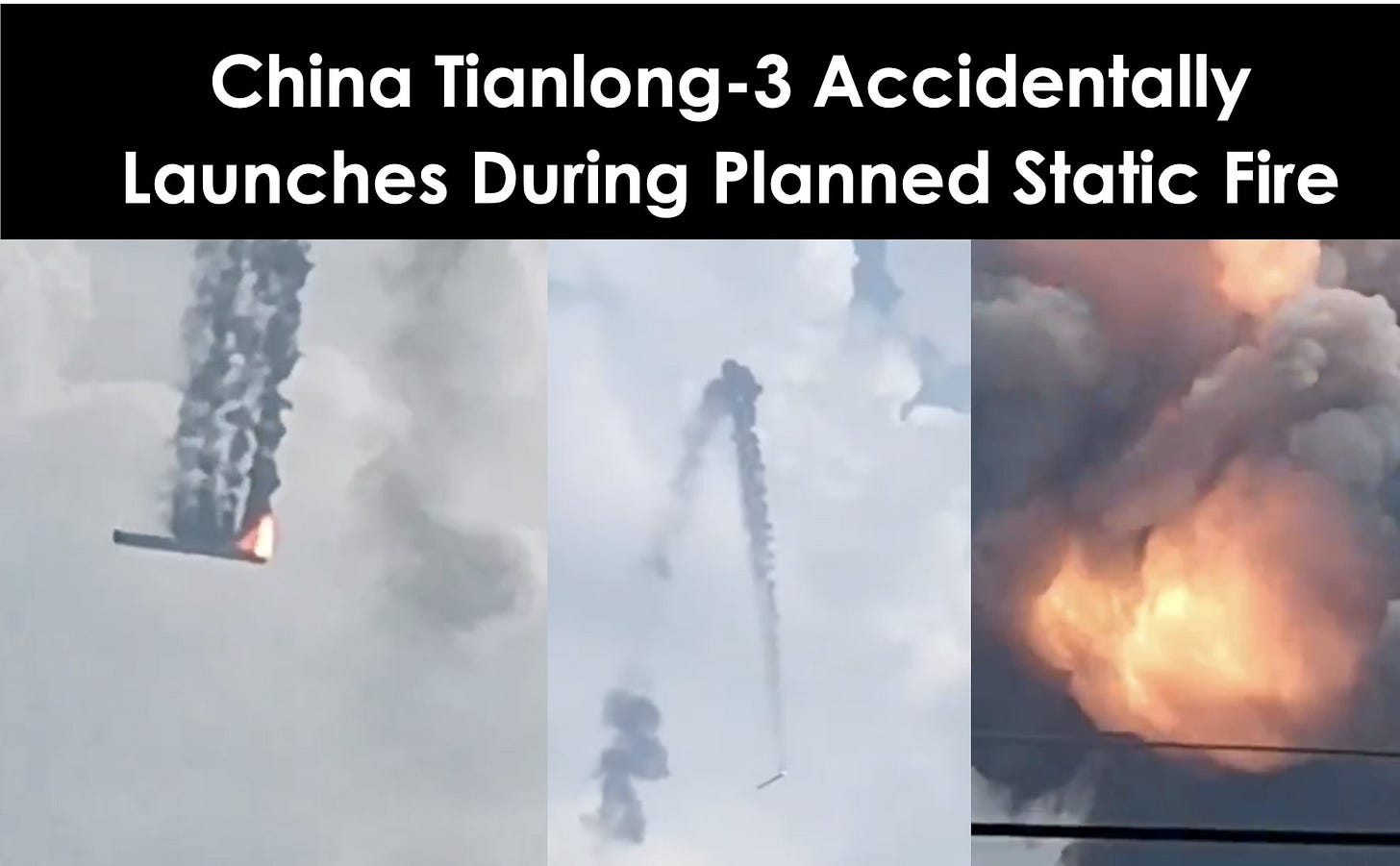 Amateur footage captured by Gongyi citizens and posted on Chinese social media shows Tianong-3, nine-engine test stage igniting and taking off. Hold-down clamps and other structures usually prevent takeoff during a firing test.