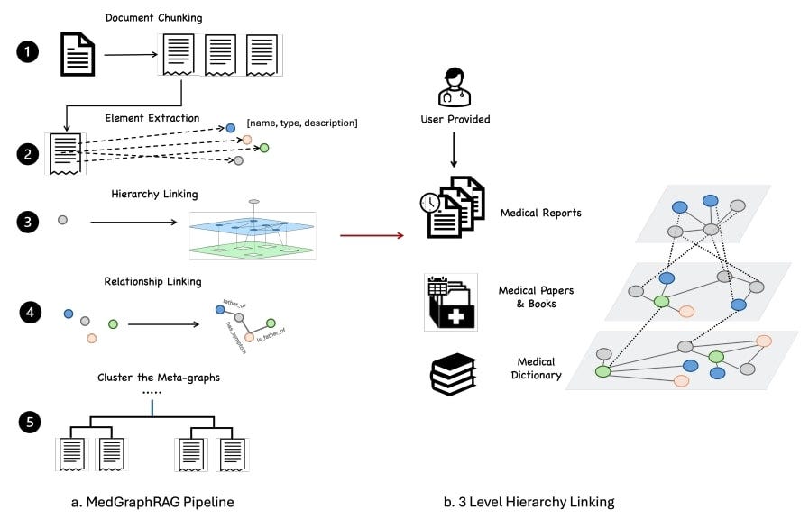 MedGraphRAG a graph-based framework for the medical domain with a focus on enhancing LLMs and generating evidence-based results. Leverages a hybrid static-semantic approach to chunk documents to improve context capture; entities and medical knowledge are represented through graphs which leads to an interconnected global graph; this approach improves precision and outperforms state-of-the-art models on multiple medical Q and A benchmarks.